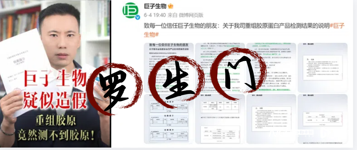 简单回顾事件发展脉络,美妆博主“大嘴博士”郝宇在5月24日发布视频炮轰巨子生物旗下的可复美胶原棒产品涉嫌对产品的核心成分——重组胶原蛋白含量进行虚假宣传。他展示检测报告称,产品中重组胶原蛋白真实添加量仅为0.0177%,但产品成分标注在“非微量成分”里,这一成分的理论添加量应该在0.1%以上,质疑可复美的这款产品是否符合法规。此后,巨子生物于连夜发布了检测报告予以反驳并坚决否认造假指控,随后郝宇再次质疑可复美的自测方法存在问题。在此期间,一直被视为巨子生物“竞对”的华熙生物突然参与到这场舆论战中,公开发表声明支持郝宇,并表示自己已经拿到第三方机构的检测结果,希望相关企业主动面对发展中的问题。